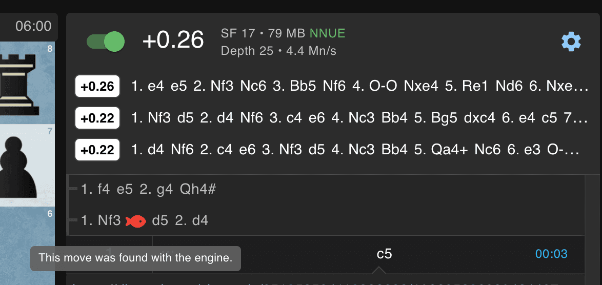 Engines - Stockfish 17 (desktop version) and Stockfish 16 (mobile version) are now both available in our game annotator. Both engines run locally in your browser, although we plan to add stronger, cloud-based engines soon. Of course, with great power comes great responsibility, and the Dojo has always advocated thoughtful analysis rather than regurgitating engine lines. We still encourage all our users to fully analyze their games on their own and come to their own conclusions before checking the engine. To push you in the right direction, clicking a new engine line will add a fish icon to your PGN, so that everyone can see which moves were found with Stockfish: