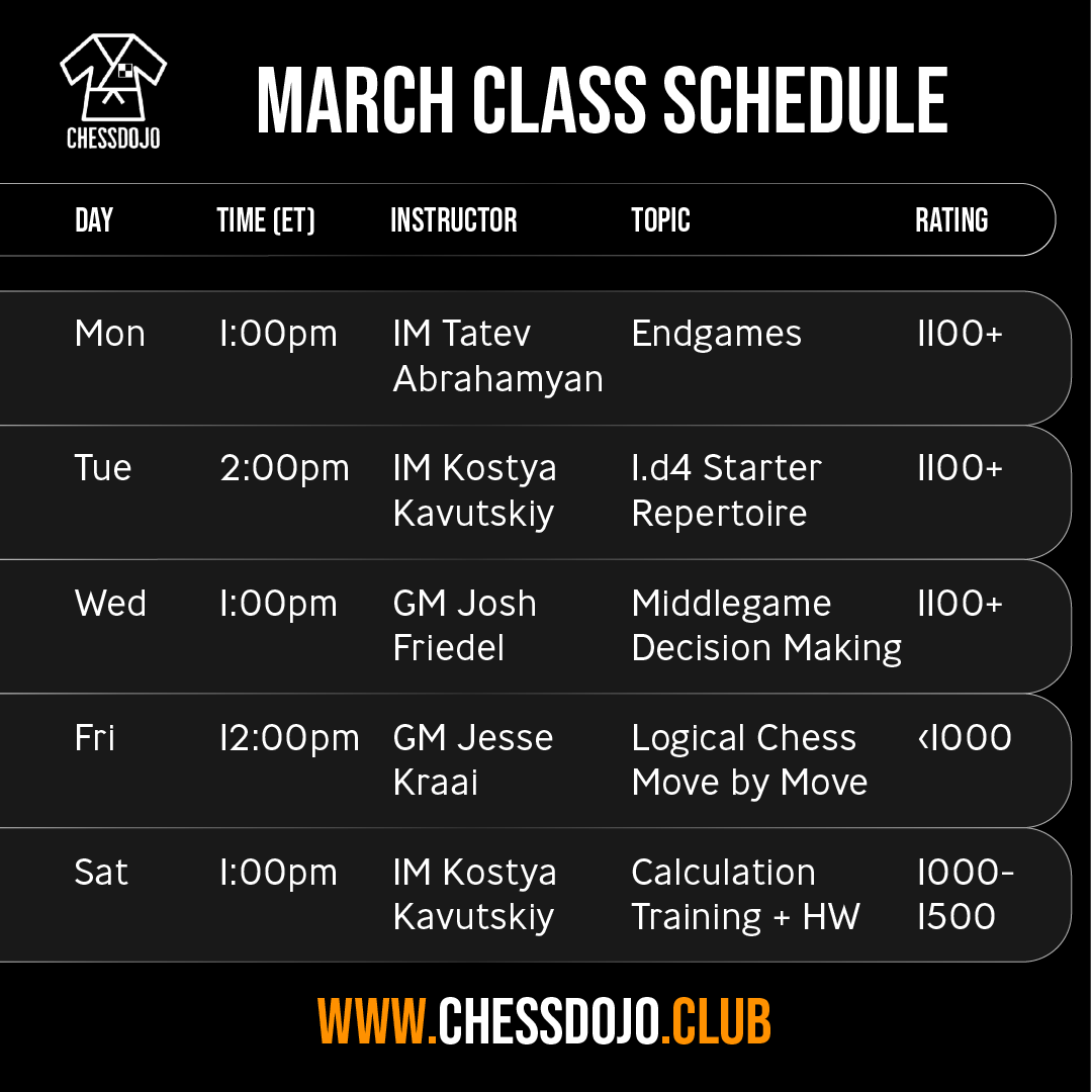 March Classes — Our live lecture schedule is available. IM Tatev Abrahamyan and GM Josh Friedel are returning to continue their series on endgames and middlegames. IM Kostya Kavutskiy will continue his 1.d4 starter repertoire and calculation classes. GM Jesse Kraai is teaching a new class, covering Chernev's book Logical Chess Move by Move.